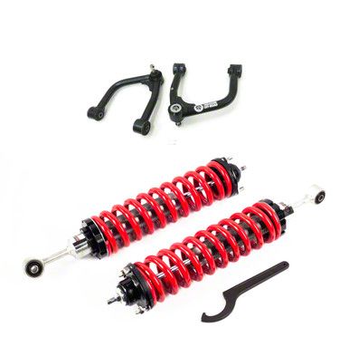 Installation. Remove factory struts and upper arms, install the adjustable coil-over assemblies to the strut towers, bolt in the new upper control arms, connect extended brake lines, then adjust preload collars to desired height before lowering the vehicle and tightening all fasteners to Toyota torque specifications.