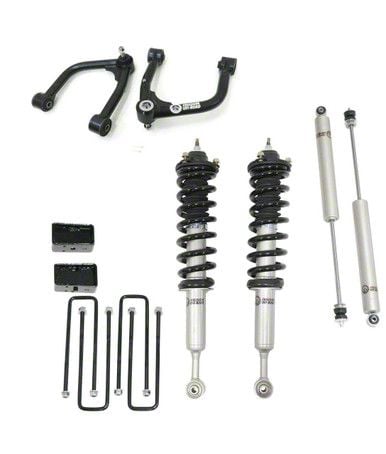 Construction and Appearance. This kit includes pre-assembled front struts with springs and top mounts for immediate install, nitrogen-charged rear shocks with 40mm pistons, and carbon steel lift blocks. Tubular upper control arms made from 1.5" DOM tubing improve suspension geometry and come equipped with OE-style ball joints and hardened rubber bushings. The hardware is engineered for strength and longevity with corrosion-resistant finishes and precise brake/ABS line provisions.