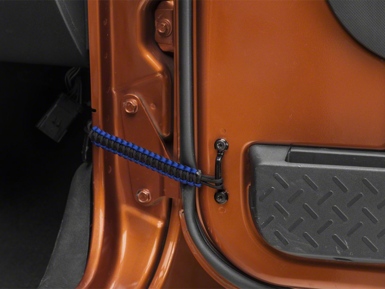 Paracord Door Limiters. These Black and Blue Front Paracord Door Limit Straps keep your Wrangler's doors from swinging out too far, and work to ensure they don't slam against rocks or obstacles on rough terrain when you're stopped at an angle. They're easily removable, requiring no tools, and are woven from 3 strands of Paracord – the same ultra-strong stuff the Army uses in its parachutes.