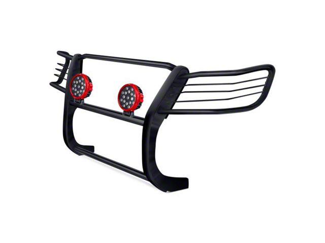 Guard and Illuminate. It guards your grille and illuminates your way, that is what the Grille Guard with 7-Inch Black Round LED Lights offers. This grille guard is a durable structure designed to protect your front bumper, lights, and grille details from damage caused by minor collisions. It features vertical vinyl straps that protect it from minor scrapes and bumps. This grille guard also includes a pair of 7-inch round LED lights in black housing for added illumination, especially when driving off-road.