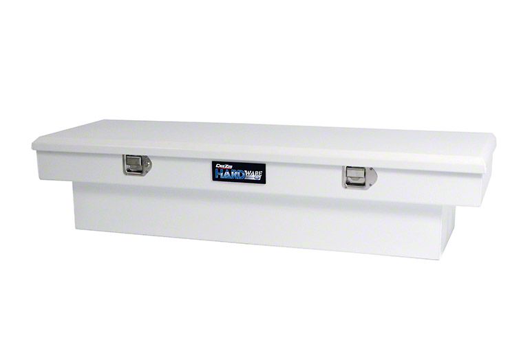 Dee Zee Tool Box - Hardware Series Single Lid Crossover. Constructed of durable 20-gauge steel. Protected by wrinkle white NRT(TM) (No Rust Technology) rust inhibitor powder coat finish. Crown style lid with a full pan double-V stiffener for superior rigidity. Other features: lockable stainless steel paddle handles, dampened gas shocks, closed cell foam gasket, and self-adjusting strikers. Removable plastic tool tray to help keep small items organized.