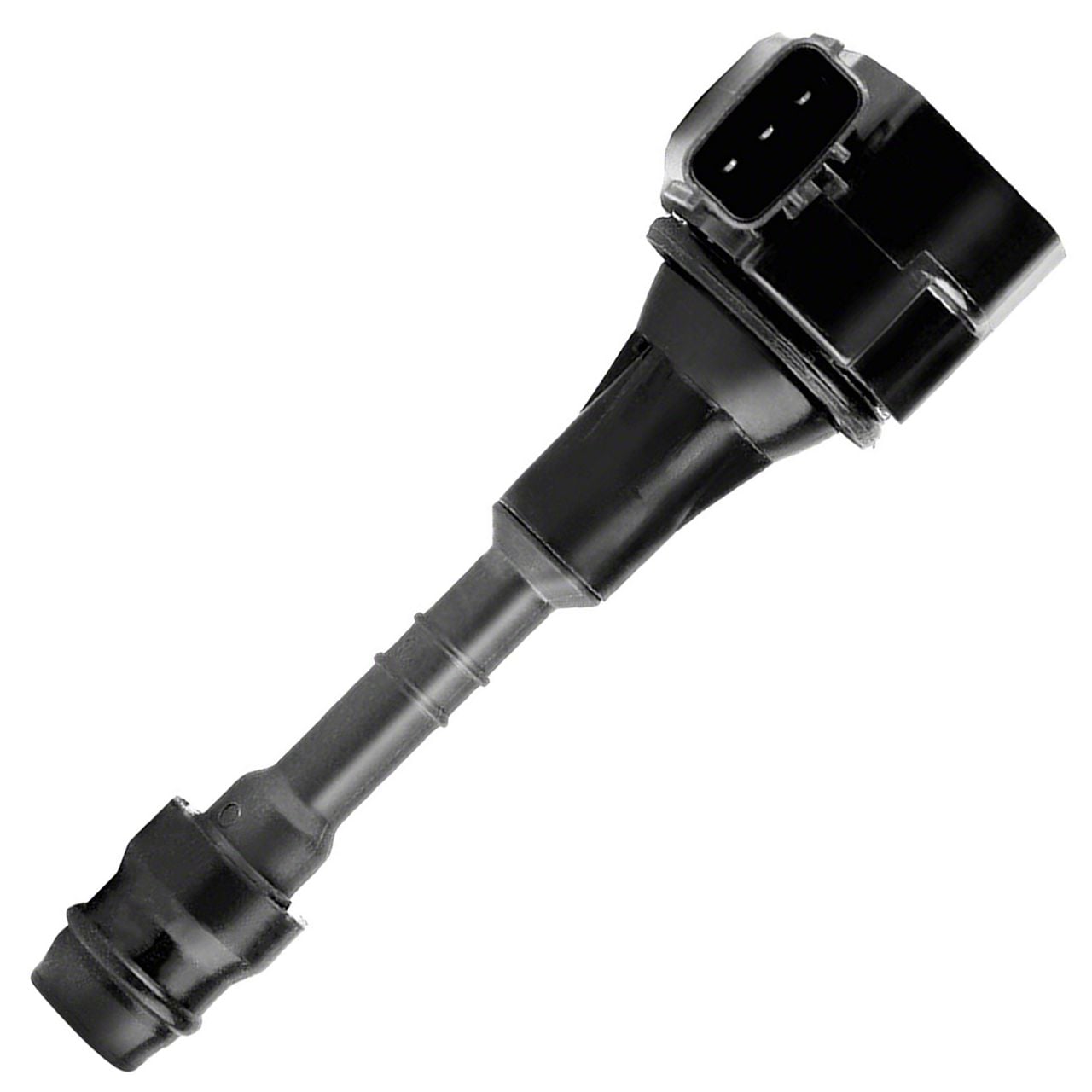 Construction and Appearance. Constructed with durable black housing, this ignition coil features a rectangular connector with three blade terminals. It is built to withstand harsh operating conditions and includes insulating grease for protection against moisture and corrosion.