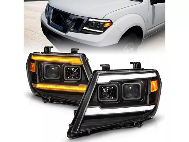 Application. This Light Bar Style Projector Headlights with Sequential Turn Signals in Black Housing and Clear Lens fits all 2009-2021 Nissan Frontier models.