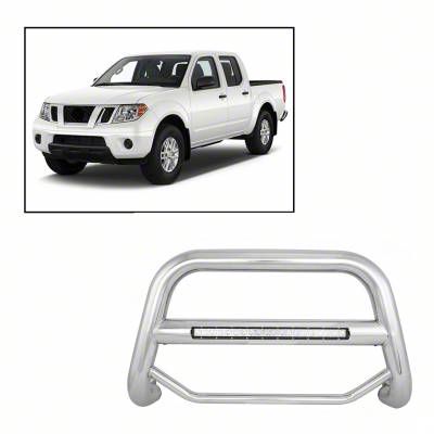 Robust Protection and Illumination. The Max Beacon LED Bull Bar provides exceptional front-end protection for your Frontier. Featuring an integrated LED light bar, this bull bar enhances visibility during nighttime or off-road driving, ensuring both safety and style.
