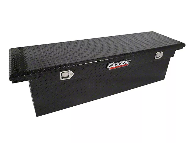 Construction and Appearance. Crafted from heavy-duty brite-tread aluminum, the Red Label Series Crossover Tool Box is built for durability and long-lasting performance. The glossy black finish adds a sleek and professional look, while the low profile design ensures it fits seamlessly with your vehicle's bed. The crown-style single lid design provides easy access to the interior, making it practical for everyday use.