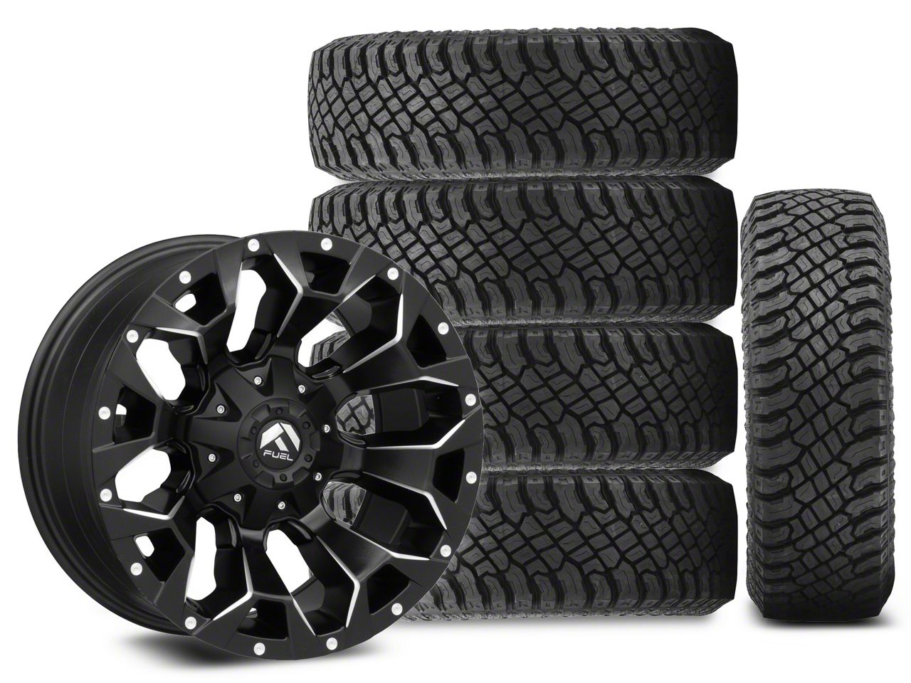 Mounted and Balanced Wheel and Tire Kit. This wheel and tire combo kit features (5) 18x9 Fuel Assault Satin Black Machined Wheels and (5) Atturo Trail Blade X/T Multi-Terrain 275/70R18 tires that have been put together into an easy to buy kit that arrives to your door already mounted and balanced ready to be installed on your vehicle.