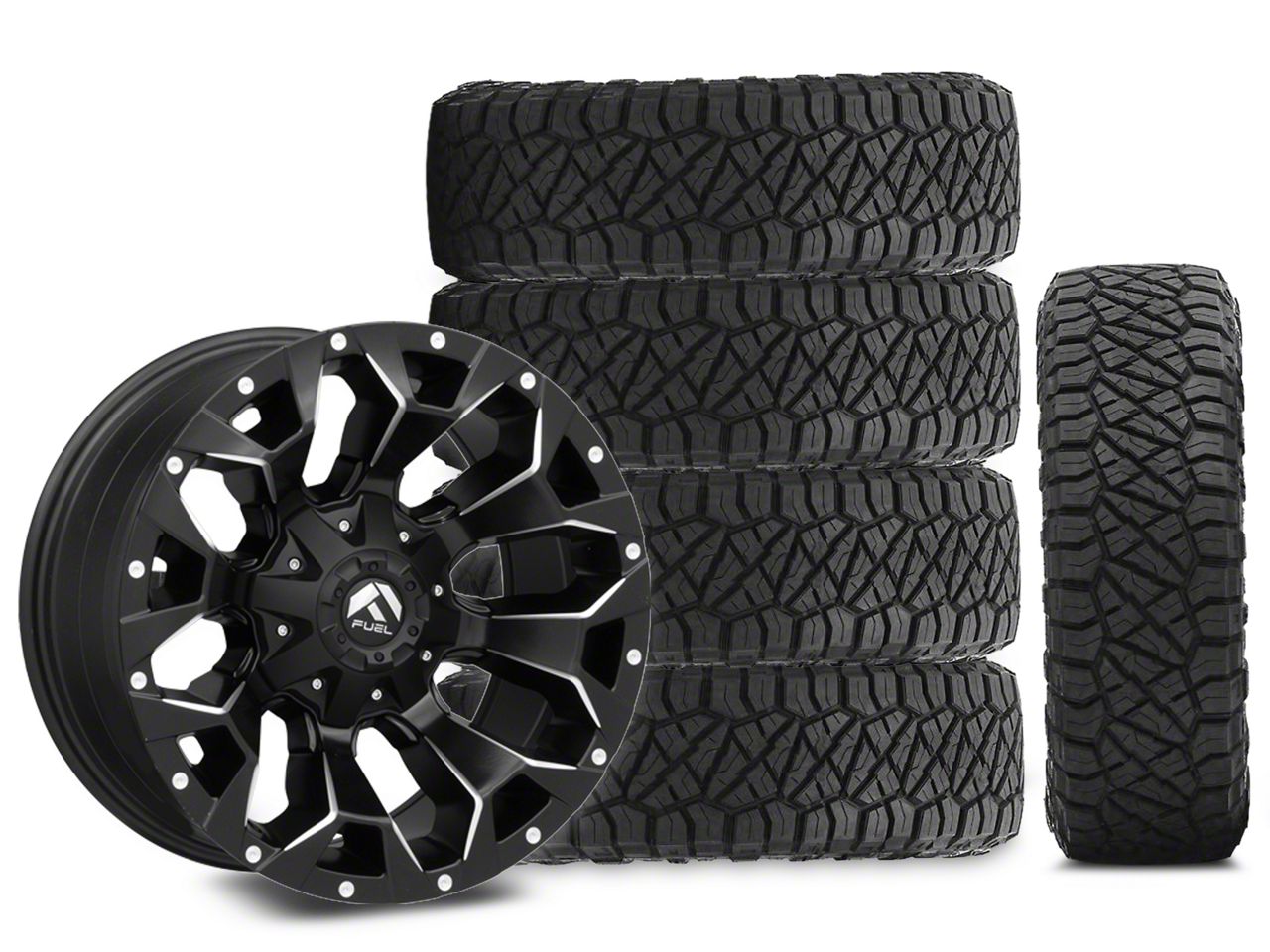 Mounted and Balanced Wheel and Tire Kit. This wheel and tire combo kit features (5) 18x9 Fuel Assault Satin Black Machined Wheels and (5) NITTO Ridge Grappler All-Terrain 35x12.50R18 tires that have been put together into an easy to buy kit that arrives to your door already mounted and balanced ready to be installed on your vehicle.