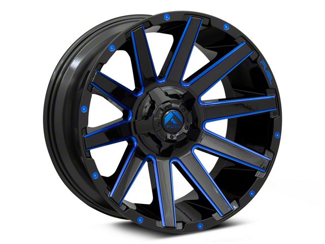 The 20x9 Fuel Wheels Contra Gloss Black with Blue Tinted Clear 6-Lug Wheel is painted in a stunning black hue, and features blue accents for an impressive head-turning presentation.