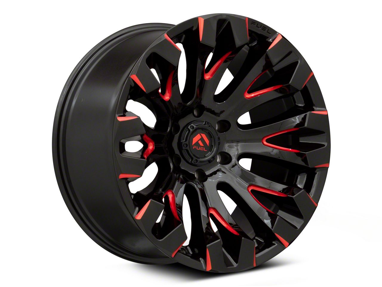 Fuel Wheels Quake Gloss Black Milled with Red Accents 6-Lug Wheel; 20x10; -18mm Offset: Immerse your vehicle in style and elegance with this wheel's captivating matte black finish. The unique 10-hole design of this Mammoth wheel sets your vehicle apart, making a statement on the road. Whether cruising the city streets or heading out for a weekend escape, this wheel complements a wide range of vehicle styles.