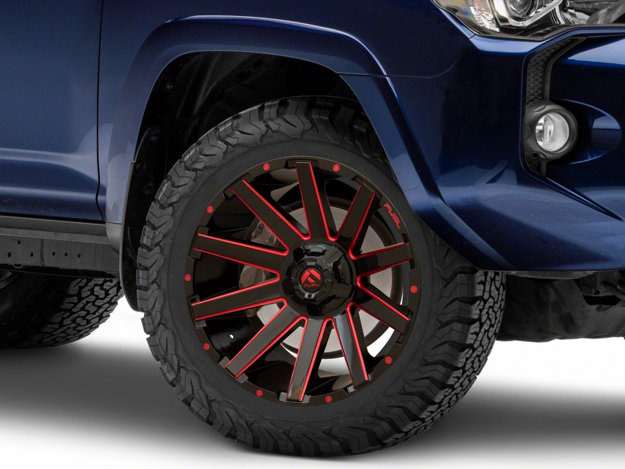 Application. This Fuel Wheels Contra Gloss Black with Red Tint 6-Lug Wheel; 20x10; -18mm Offset, with a backspace of 4.792 Inch, 121.8mm and bolt pattern of 6 x 139.7mm (6 x 5.5-Inch), is designed to enhance alignment and driving stability, ensuring a perfect fit with the vehicle model. Specifically designed to fit 2010-2023 4Runner models, this wheel's specifications contribute to a seamless alignment and stable driving experience by ensuring the wheel fits perfectly within the vehicle's wheel well, reducing the risk of rubbing issues and optimizing handling characteristics. Sold individually.