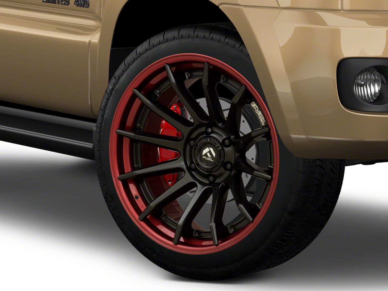 Fuel Wheels Fusion Forged Burn Matte Black with Candy Red Lip 6-Lug Wheel; 22x10; -18mm Offset. Enhance your vehicle's look with the Fuel Wheels Fusion Forged Burn Matte Black with Candy Red Lip 6-Lug Wheel. This premium wheel adds a touch of elegance and class to your vehicle, complementing its sophisticated aesthetic.