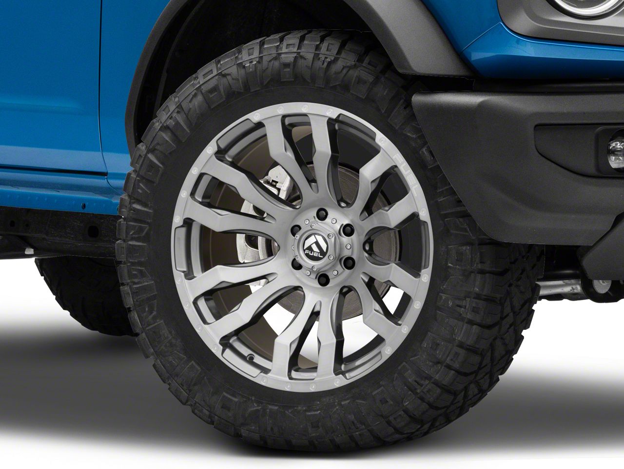 Application. This Fuel Wheels Blitz Platinum Brushed Gunmetal 6-Lug Wheel; 20x9; 1mm Offset with a backspace of 5.04 Inch, 128.1mm; and bolt pattern of 6 x 139.7mm (6 x 5.5-Inch), contributes to alignment, driving stability, and ensures a perfect fit with the vehicle model. Designed to fit the 2021-2026 Bronco, Excluding Raptor. Sold individually.