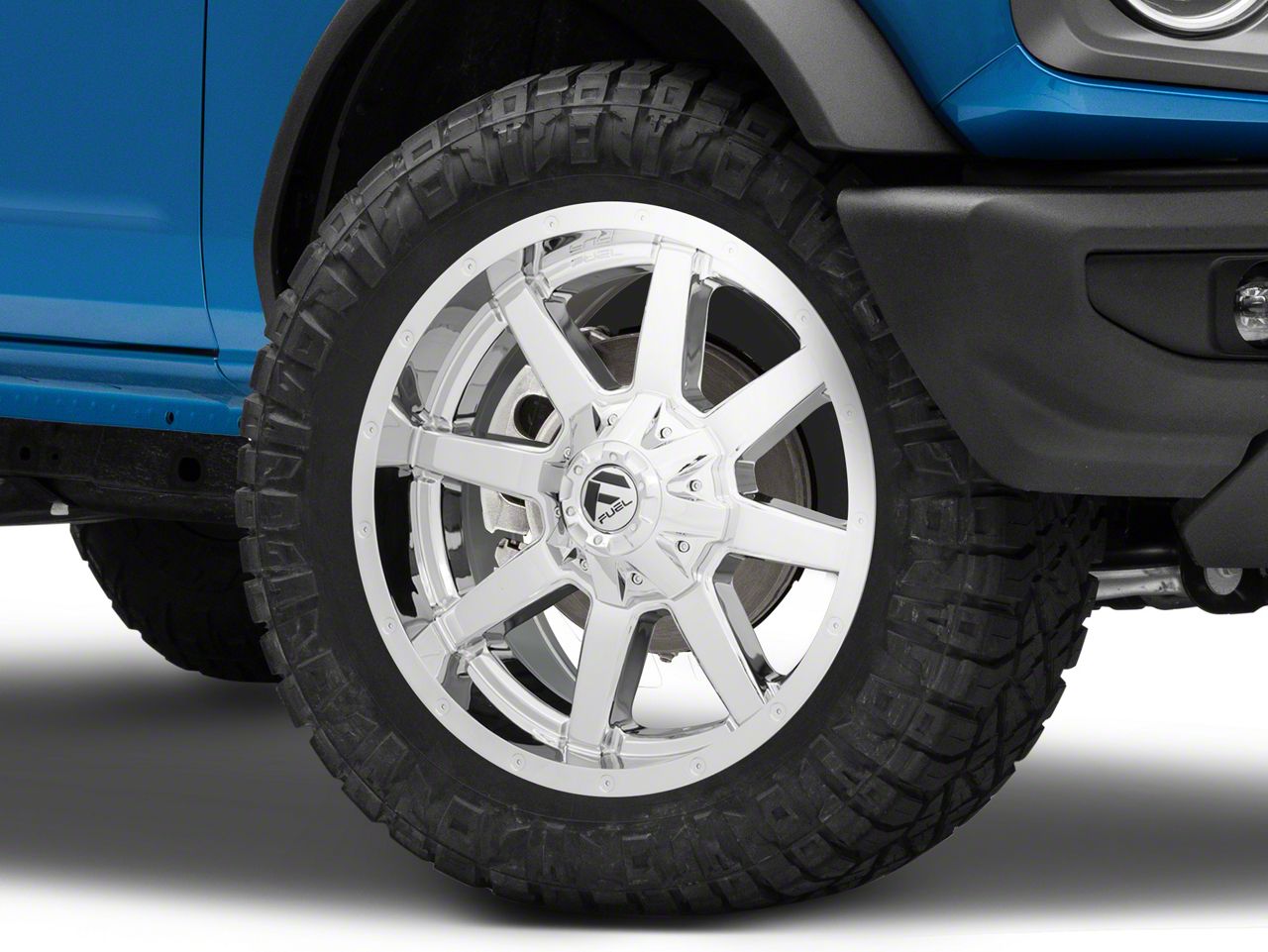 Application This Fuel Wheels Maverick Chrome 6-Lug Wheel; 20x9; 1mm Offset, with a backspace of 5.04 Inch, 128.1mm and a bolt pattern of 6 x 139.7mm (6 x 5.5-Inch), contributes to optimal wheel alignment and driving stability. Designed to fit the 2021-2025 Bronco, Excluding Raptor models, it offers a seamless integration with your vehicle. Sold individually, it's a top choice for a tailored vehicle look.