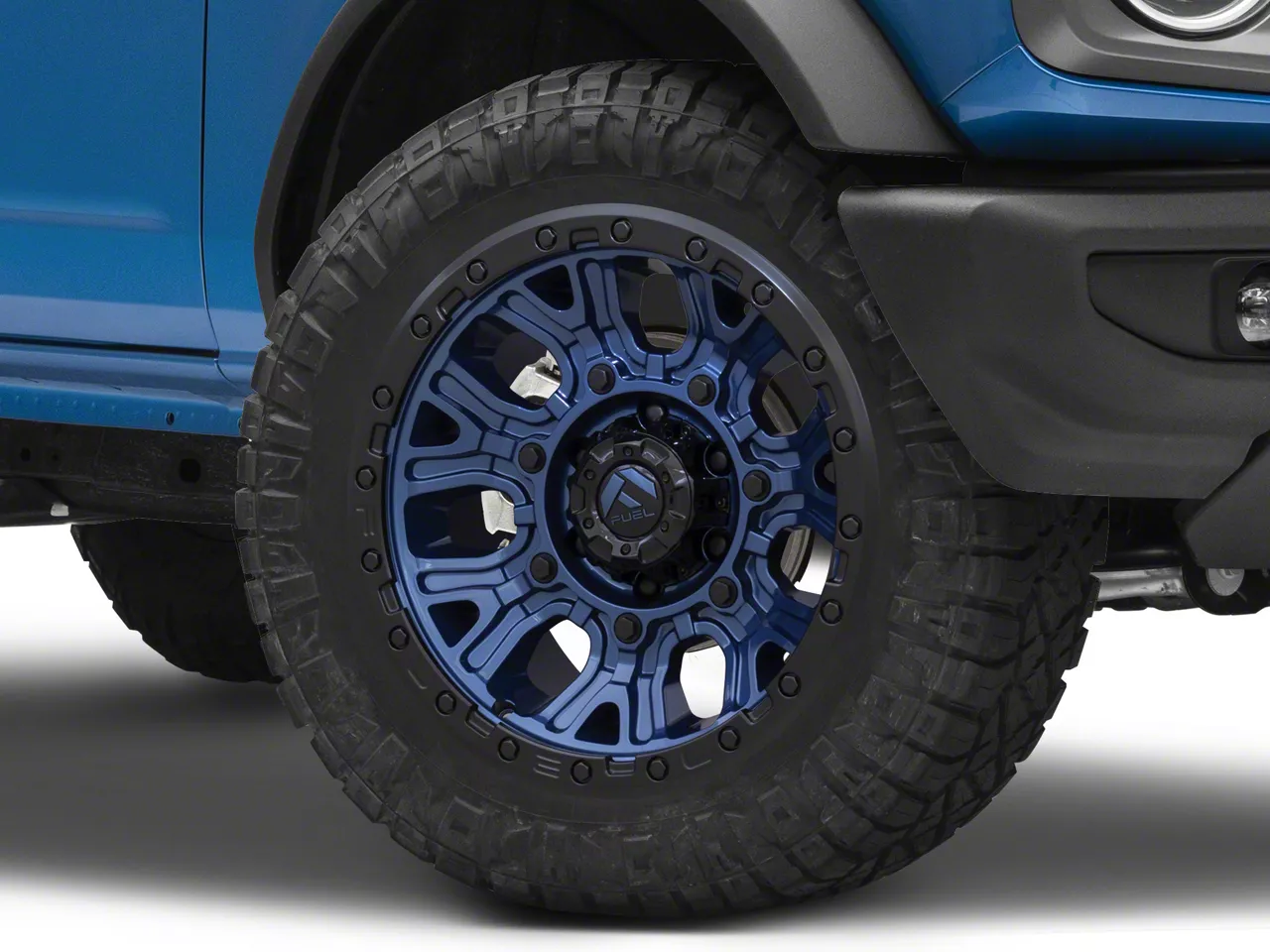 Application. This Fuel Wheels Traction Dark Blue with Black Ring 6-Lug Wheel; 20x10, with a backspace of 4.791 Inch, 121.7mm and a bolt pattern of 6 x 139.7mm (6 x 5.5-Inch), is designed to enhance alignment and driving stability. It's specially designed to fit the 2021-2026 Bronco, Excluding Raptor models, sold individually.