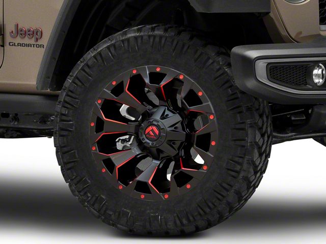 Application. This Jeep Gladiator Assault Matte Black Red Milled Wheel; 20x9 with a backspace of 5.04 Inch, 128.1mm and bolt pattern of 5 x 127mm (5 x 5-Inch) ensures impeccable alignment and driving stability. It's designed to fit the 2020-2025 Jeep Gladiator JT models and is sold individually.