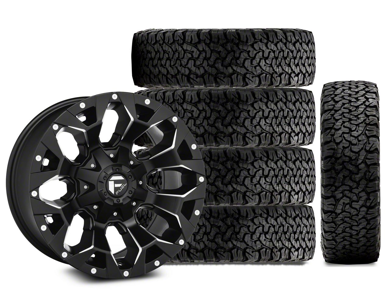 Mounted and Balanced Wheel and Tire Kit. This wheel and tire combo kit features (5) 17x9 Fuel Wheels Assault Matte Black Machined Wheels and (5) BF Goodrich All-Terrain T/A KO 285/70R17 tires that have been put together into an easy to buy kit that arrives to your door already mounted and balanced ready to be installed on your vehicle.