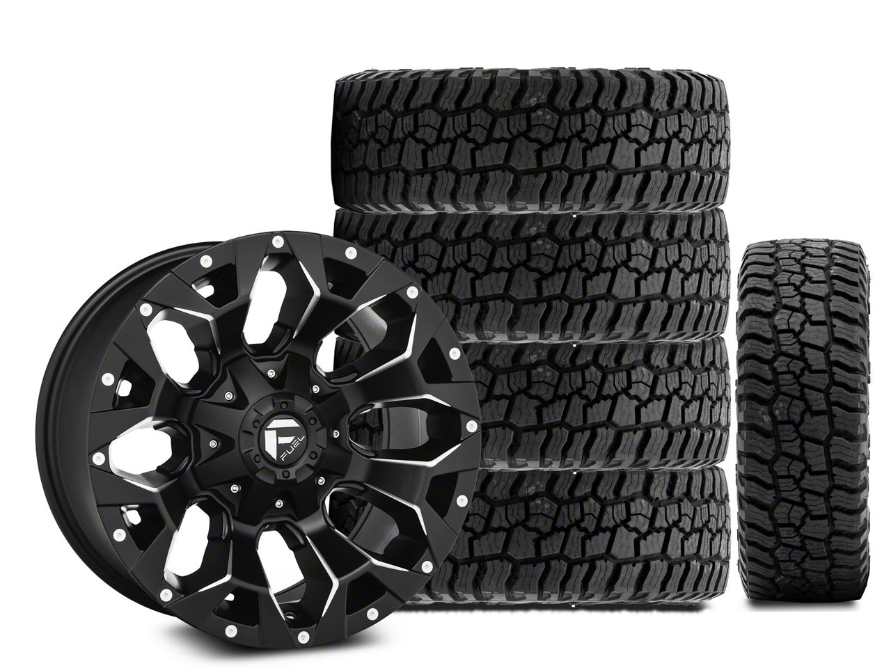 Mounted and Balanced Wheel and Tire Kit. This wheel and tire combo kit features (5) 17x9 Fuel Wheels Assault Matte Black Machined Wheels and (5) Mickey Thompson All-Terrain Baja Boss 315/70R17 tires that have been put together into an easy to buy kit that arrives to your door already mounted and balanced ready to be installed on your vehicle.