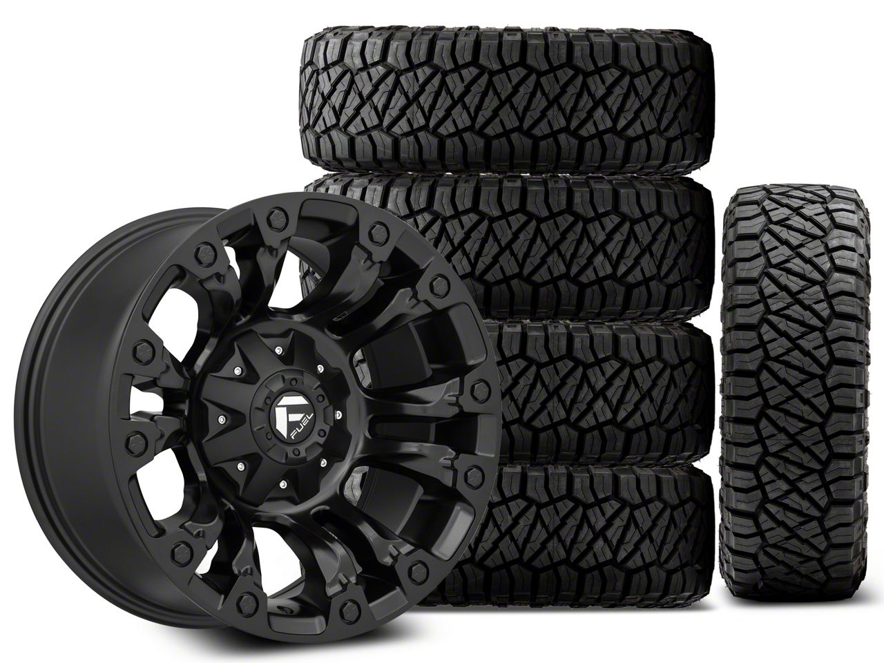 Mounted and Balanced Wheel and Tire Kit. This wheel and tire combo kit features (5) 18x9 Fuel Wheels Vapor Matte Black Wheels and (5) NITTO All-Terrain Ridge Grappler A/T 275/70R18 tires that have been put together into an easy to buy kit that arrives to your door already mounted and balanced ready to be installed on your vehicle.