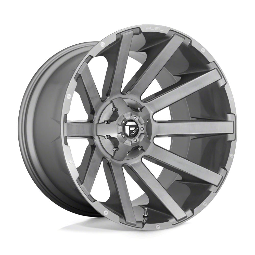 The 24x14 Fuel Wheels Contra Platinum Brushed Gunmetal with Tinted Clear Wheel is completed in a high-quality brushed gunmetal finish with contrasting accents for an aggressive appearance that will turn heads. This wheel features a durable clear coat that stands up to the hazards of everyday driving.