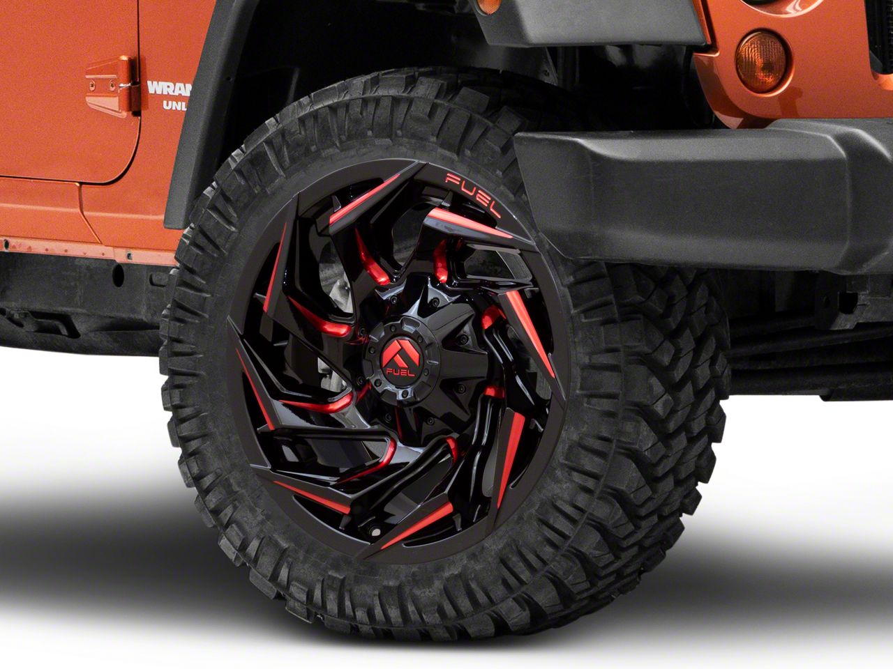 ExtremeTerrain no longer carries the Fuel Wheels Reaction Gloss Black Milled with Red Tint Wheel; 24x12; -44mm Offset (07-18 Jeep Wrangler JK). Please check out Jeep CJ7 Wheels & Tires for 1976-1986 Wrangler for an updated selection.