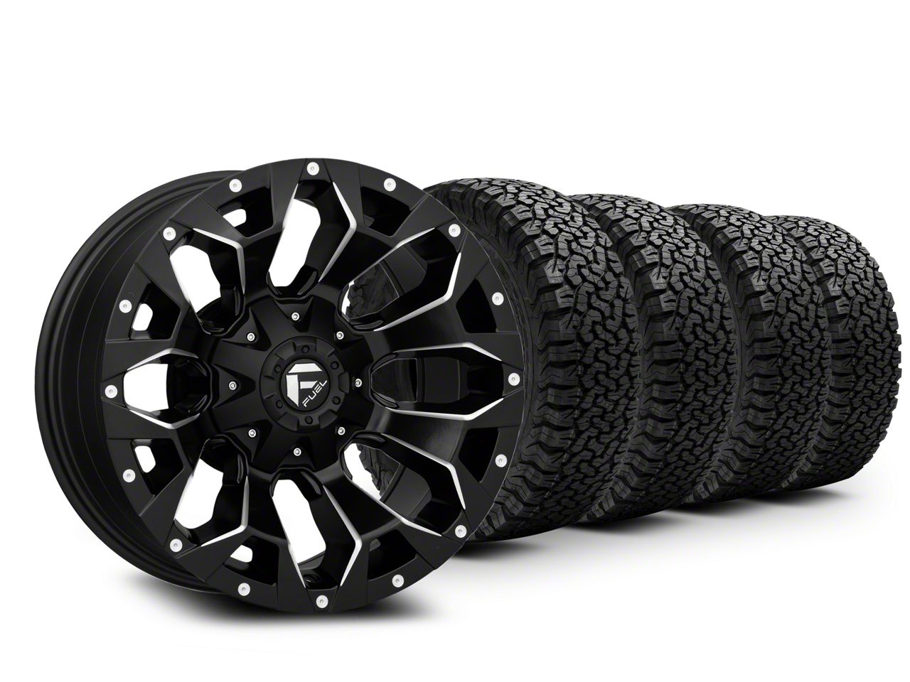 Mounted and Balanced Wheel and Tire Kit. This wheel and tire combo kit features (4) 17x9 Fuel Wheels Assault Satin Black Milled 6-Lug Wheels and (4) BF Goodrich All-Terrain T/A KO 265/70R17 tires that have been put together into an easy to buy kit that arrives to your door already mounted and balanced ready to be installed on your vehicle.