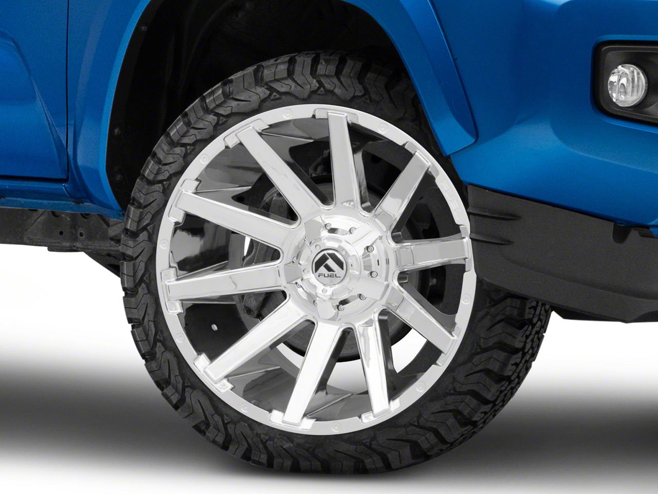 Application. This Fuel Wheels Contra Chrome 6-Lug Wheel; 22x10; -19mm Offset, with a backspace of 4.752 Inch, 120.7mm and bolt pattern of 6 x 139.7mm (6 x 5.5-Inch), is designed to provide not only a striking visual appeal but also to contribute significantly to the alignment and driving stability of the vehicle. Its specifications ensure a precise fit with the vehicle model, enhancing the overall driving experience. Built to fit the 2016-2023 Tacoma, this wheel is sold individually.