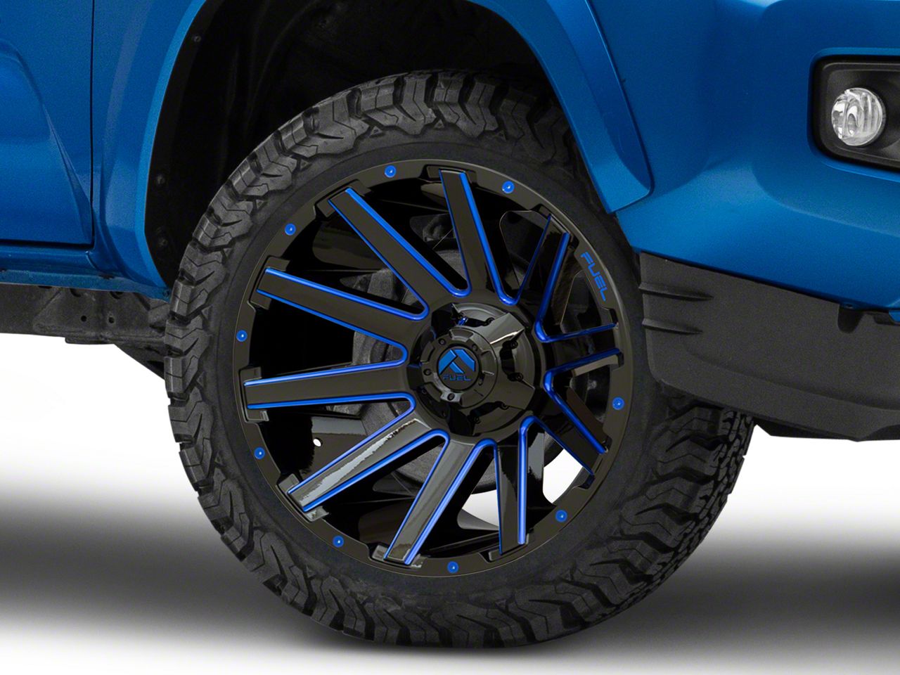 Application. This Fuel Wheels Contra Gloss Black with Blue Tinted Clear 6-Lug Wheel; 20x9; 2mm Offset with a backspace of 5.079 Inch, 129.1mm; and bolt pattern of 6 x 139.7mm (6 x 5.5-Inch), contributes to alignment, driving stability, and ensures a perfect fit with the vehicle model. Designed to fit the 2016-2023 Tacoma. Sold individually.