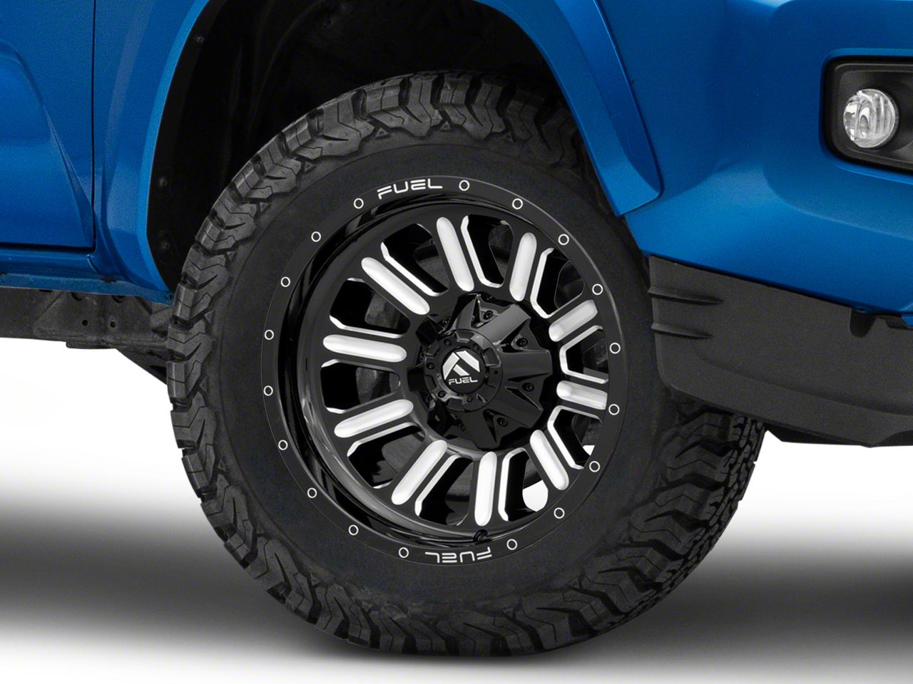 Application. This Fuel Wheels Hardline Gloss Black Milled 6-Lug Wheel; 18x9; 20mm Offset, with a backspace of 5.788 Inch, 147.1mm and bolt pattern of 6 x 139.7mm (6 x 5.5-Inch), ensures optimal alignment and driving stability. It is designed to fit 2016-2023 Tacoma models. Sold individually.