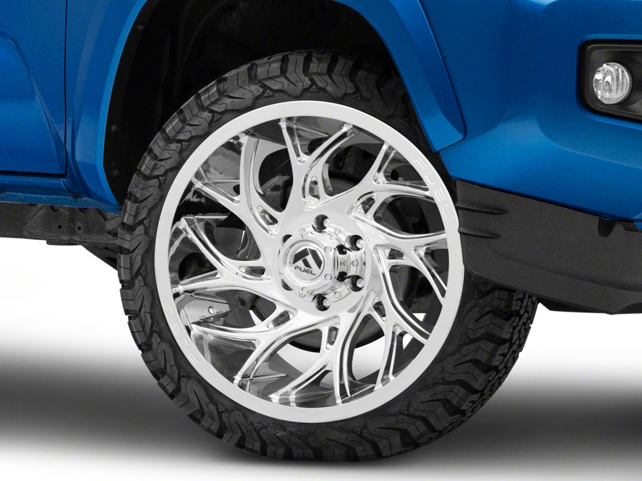 Application. This Fuel Wheels Runner Chrome 6-Lug Wheel; 24x12; -44mm Offset with a backspace of 4.768 Inch, 121.2mm; and bolt pattern of 6 x 139.7mm (6 x 5.5-Inch), contributes to alignment, driving stability, and ensures a perfect fit with the vehicle model. Designed to fit the 2016-2023 Tacoma. Sold individually.
