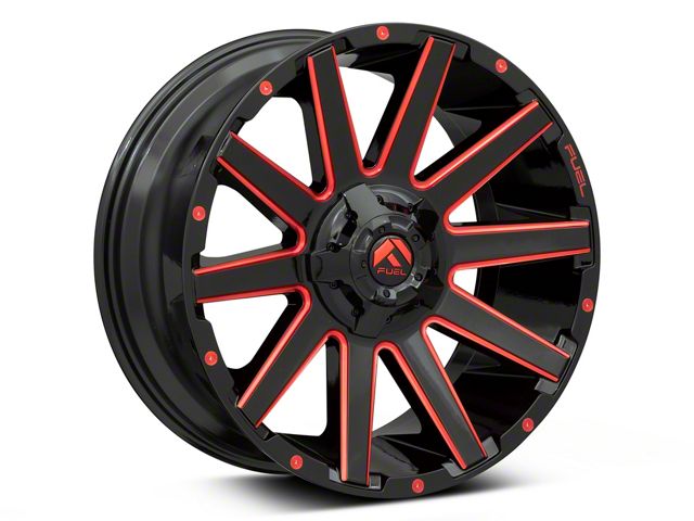 Fuel Wheels Contra Gloss Black with Red Tinted Clear 6-Lug Wheel; 20x10; -19mm Offset The Fuel Wheels Contra Gloss Black with Red Tinted Clear 6-Lug Wheel showcases a blend of race-inspired aesthetics, ideal for those seeking a premium and robust appearance. Its design complements various vehicle styles, adding sophistication.