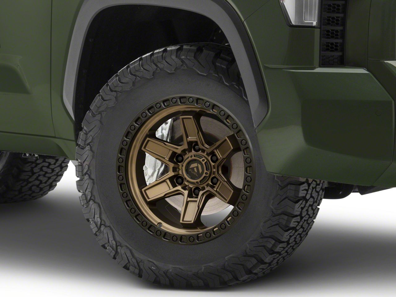 Application. This Fuel Wheels Kicker Matte Bronze with Black Bead Ring 6-Lug Wheel; 18x9; 1mm Offset with a backspace of 5.04 Inch, 128.1mm; and bolt pattern of 6 x 139.7mm (6 x 5.5-Inch) contributes to impeccable alignment and driving stability. Designed to fit 2022-2026 Tundra models, sold individually.