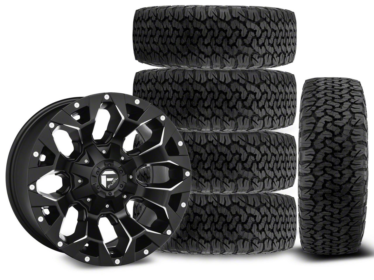 Mounted and Balanced Wheel and Tire Kit. This wheel and tire combo kit features (5) 17x9 Fuel Assault Matte Black Machined Wheels and (5) BF Goodrich All-Terrain T/A KO2 315/70R17 tires that have been put together into an easy to buy kit that arrives to your door already mounted and balanced ready to be installed on your vehicle.