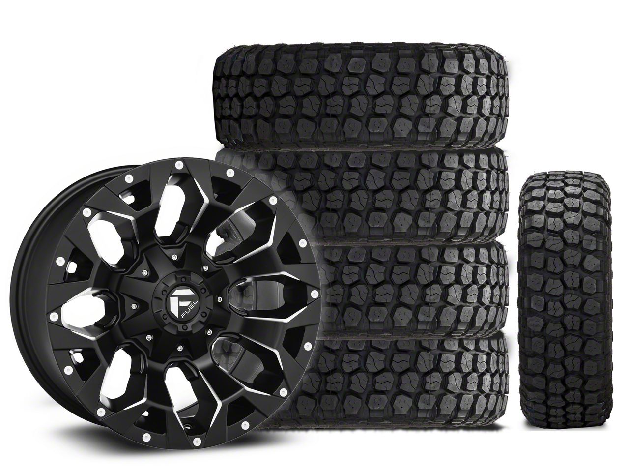 Application. This Fuel Assault Matte Black Machined; 17x9 and Ironman All Country Mud-Terrain; Set of 5 is designed to fit 2018-2026 Jeep Wrangler JL models.