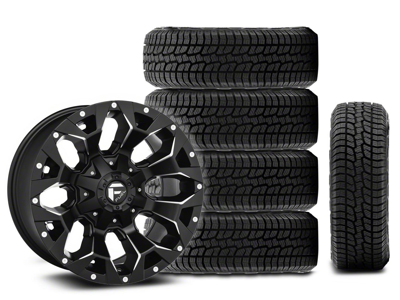 Mounted and Balanced Wheel and Tire Kit. This wheel and tire combo kit features (5) 17x9 Fuel Assault Matte Black Machined Wheels and (5) West Lake SL369 All-Terrain 35x12.50R17 tires that have been put together into an easy to buy kit that arrives to your door already mounted and balanced ready to be installed on your vehicle.