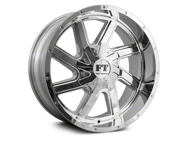 This 22x12 Full Throttle Off Road FT1 Chrome 6-Lug Wheel is completed in a high-quality polished chrome finish that was achieved in a 3-step process involving copper, nickel and chrome. There's a durable clear coat that protects against driving hazards.