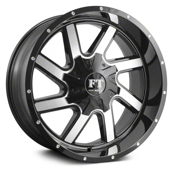 This 20x12 Full Throttle Off Road FT1 Gloss Black Machined 6-Lug Wheel is completed in a high-quality gloss black finish with machined accents to create an impressive appearance. There's a durable clear coat that protects against driving hazards.
