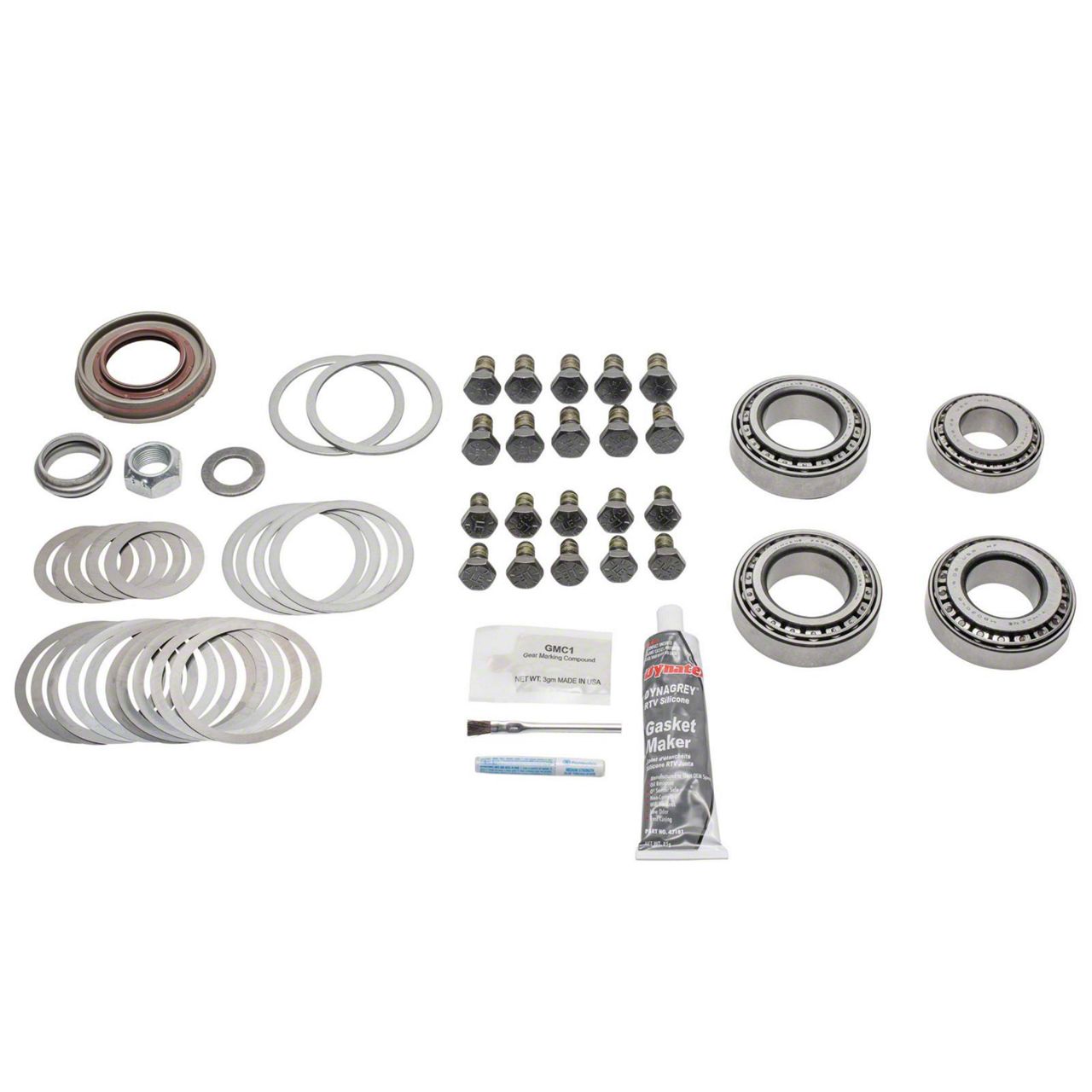 Construction. G2's rear master install kit includes thread compound, silicone sealer, several types of shims, ring gear bolts, a pinion nut and seal, and gear marking compound. It also features high quality Timken components, including a crush sleeve, plus inner pinion bearings and races, outer pinion bearings and races, and carrier bearings and races. These premium bearings are manufactured to exceed OE quality and performance standards.