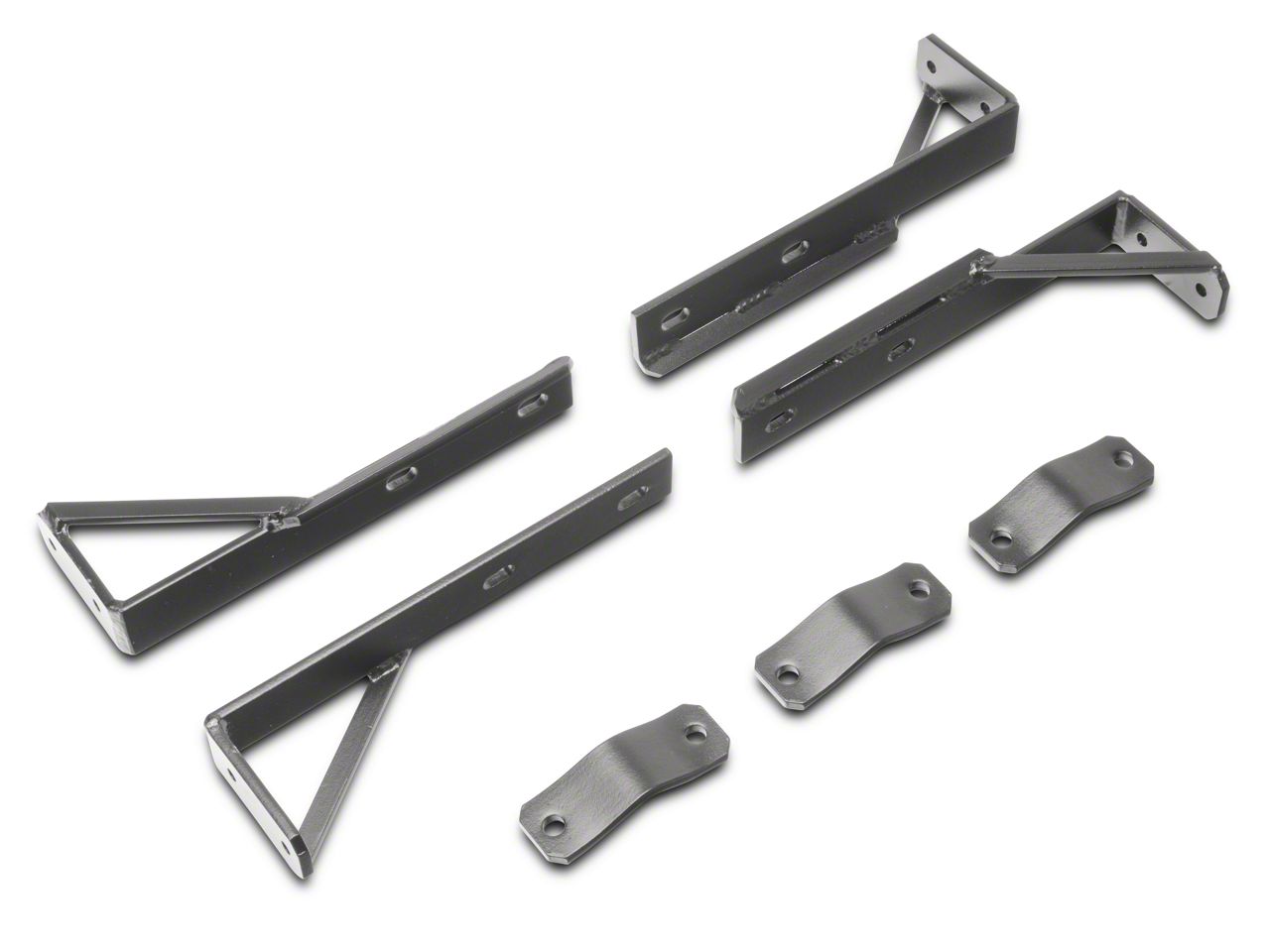Powder Coated. The 4 brackets included in the kit are created from 1/4 in. thick steel to guarantee advanced durability for long-lasting superior use. They are then powder coated black to not only give them a sleek, finished look but also enhanced reliability and protection against rust and corrosion.