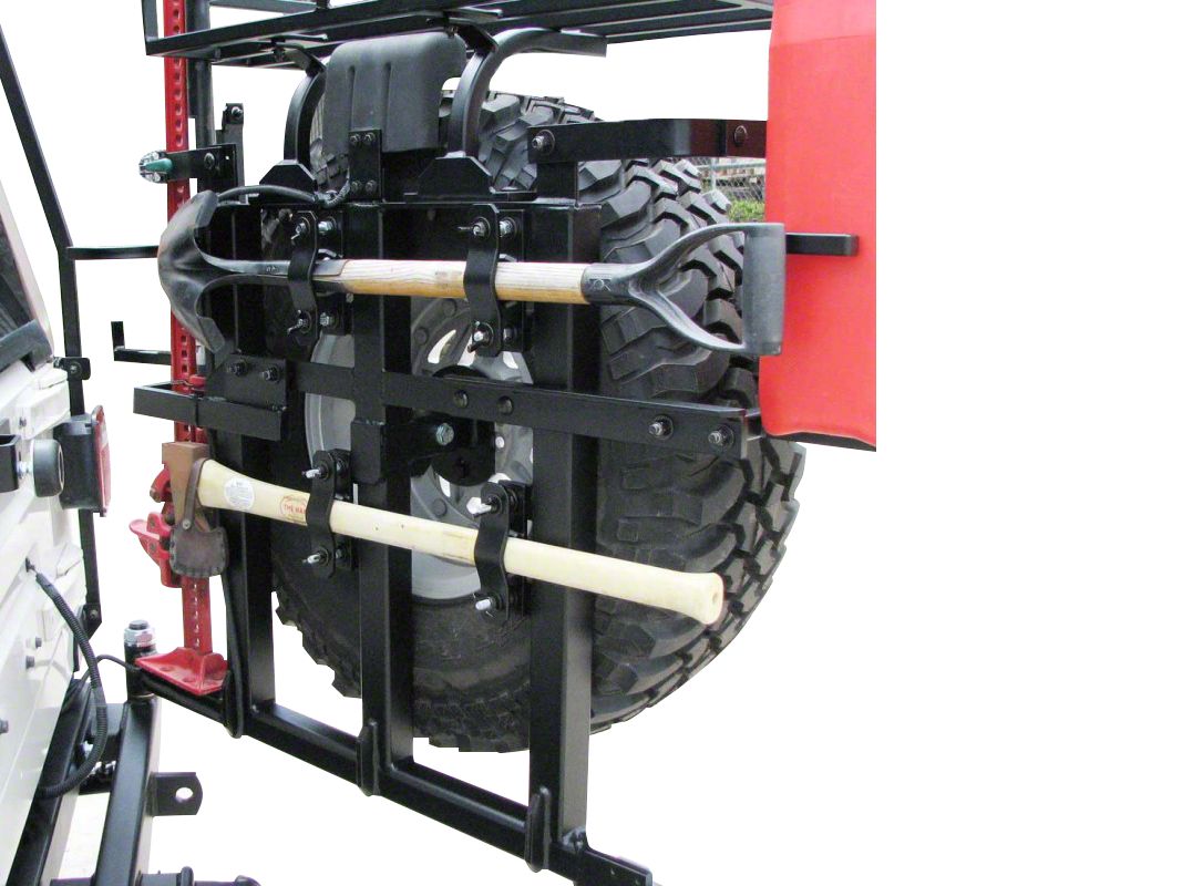 Rugged Good Looks. The Garvin Bumper Systems, including the Garvin EXT Series bring rugged off-roading good looks to your Jeep while also providing premium protection and infinite storage options. This axe and shovel mount works perfectly with the Garvin EXT Series racks and bumpers to protect your Jeep from rocks and debris from the trails. The surfaces of these brackets are black powder coating to add further protection.