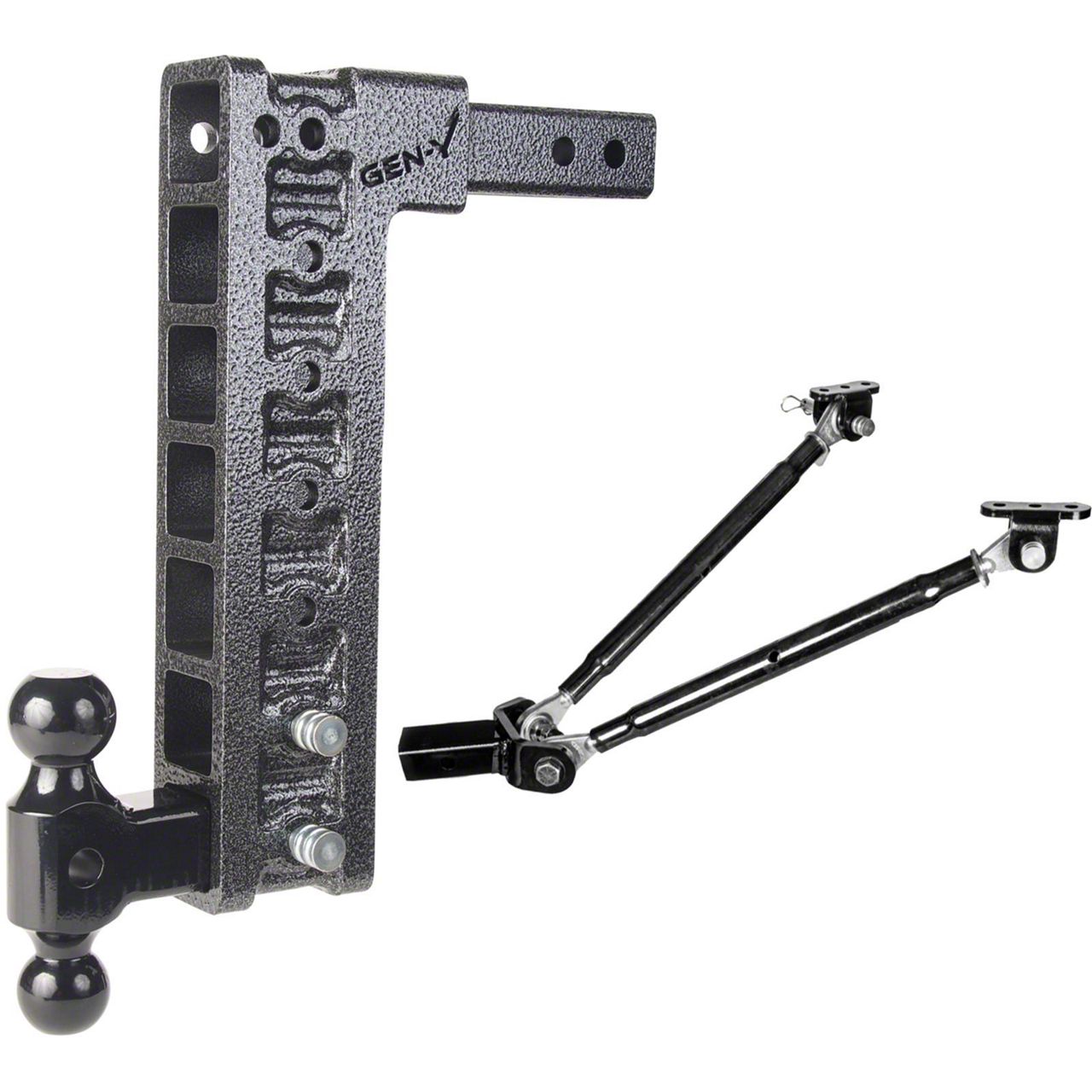 Seven-Way Adjustable Design. This Gen-Y Hitch Mega-Duty Drop Hitch offers extensive 7-way adjustability, as well as 15 inches of drop. These numerous adjustment options make this drop hitch ideal for lifted trucks, as well as a wide a range of trailer configurations. To prevent sloping, this hitch system includes a pair of adjustable stabilizer bars that provide exceptional rigidity when properly set-up. Moreover, this system also comes with a pintle lock and 2-inch/2.312-inch dual ball mounts for more versatile towing options. Finally, this hitch can be used with most 2-inch receivers.