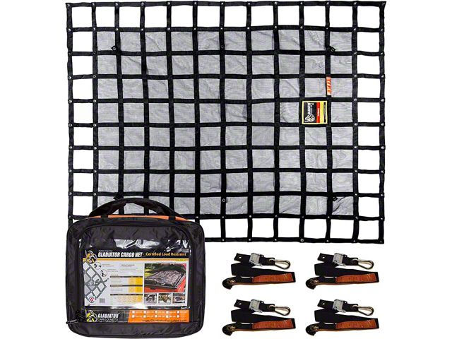 Description. Eliminate the risk of a hefty fine and reduce your chances of losing cargo by keeping your loads covered and secured with the Gladiator Cargo Net. Used by large and small fleets across the country it is the highest rated cargo net on the market. It has earned this by being easy to use, incredibly strong and durable.Our use of integrated rip-stop mesh sets us apart from the competition. The meshing makes the net smooth on one side preventing snags when securing your cargo as well as containing smaller items. It is made of industrial strength rip-stop mesh which means that even if it's punctured it won't continue to tear!Each mesh thread is comprised of thousands of smaller threads, then coated, giving it incredibly strong rip-stop properties. The Gladiator Cargo Net is built from weatherproofed, heavy-duty 1.5” webbing with triple-layered reinforced edges. This allows the net its ability to safely secure large cargo loads and take the abuse of commercial use.