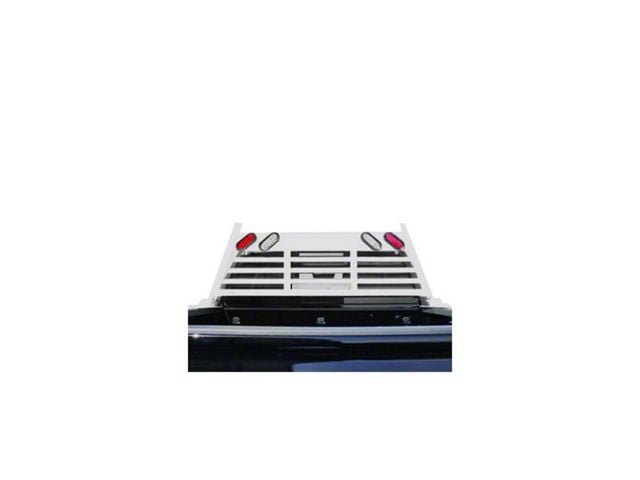 Description. Go Industries Heavy Duty Lighted Rack is constructed for heavy-duty use! Two applications fit all full size pickups. Made from a 6” x 2” steel top tube and 2” x 2” bottom and vertical tubes, with massive 24” x 3” x ¼” heavy-duty feet for extra strength. You can mount a tool box right on top of the feet! Big, 3/16” louvers protect your cab window, and comes with red and clear LED lights (optional 3rd brake light included). Available in black or white powder coat finish with a three year warranty on workmanship and materials, six month warranty on finish. Parts are proudly made in the USA.