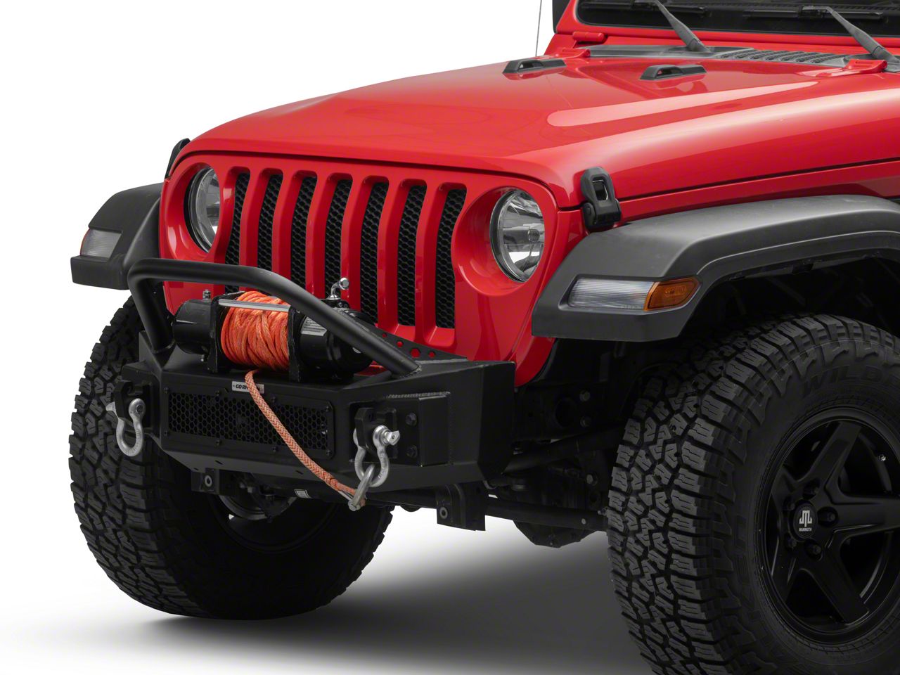 Application. This Rockline Winch Ready Front Stubby Bumper with Over Rider Light Mount Bar - Textured Black is designed to accommodate all 2018-2026 Jeep Wrangler JL models.