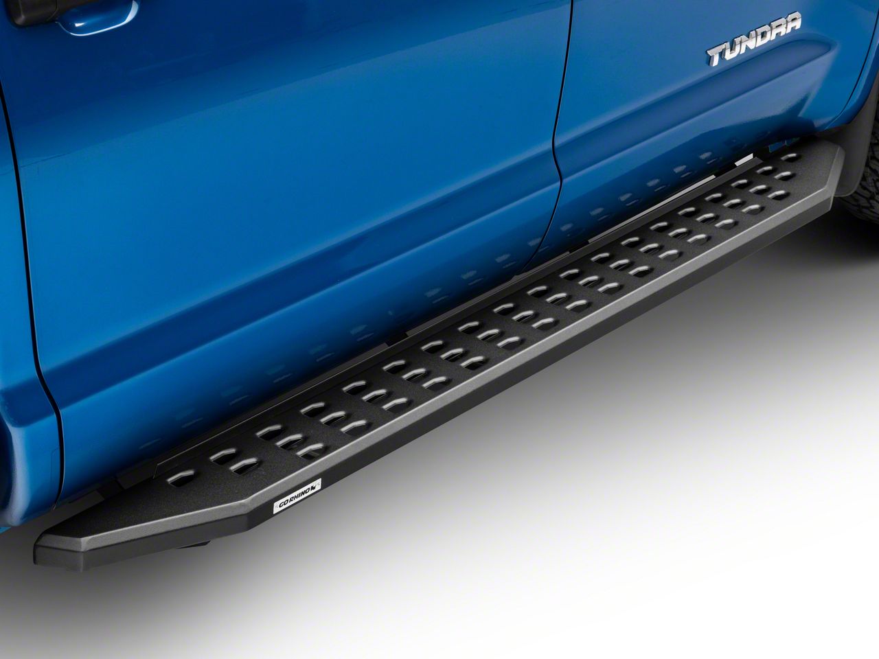 Aggressive Running Boards. These RB20 Running Boards are an excellent addition to your trail-going CrewMax Toyota Tundra. Apart from providing convenient access to your lifted truck's cab, these running boards also offer excellent protection to the sides of your vehicle against debris and mud. Indeed, these running boards are the perfect combination of style, safety, and protection that your precious truck deserves.