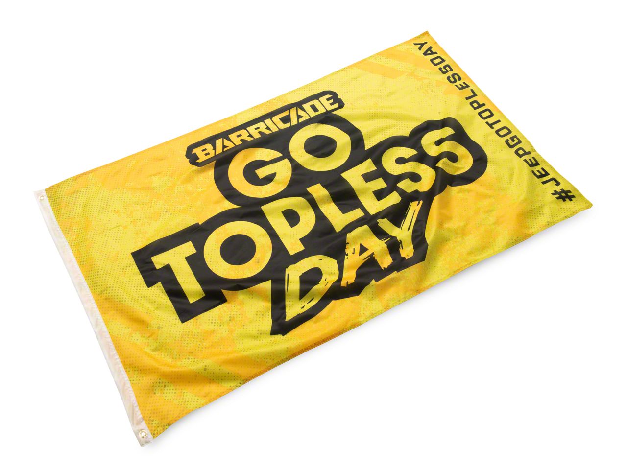 2024 Go Topless Day Flag. Celebrate the return of nice spring weather by having your Jeep go topless on Saturday May 20th, 2024. This official Barricade 2024 Go Topless Day Flag garage flag is made from a durable, premium quality polyester material that is printed in full color. With metal grommets on the corners, you can hang this garage flag anywhere you want. With this flag's generous 3 foot wide x 2 foot high size, you'll be sure that everyone knows you're a true Topless Day fan.