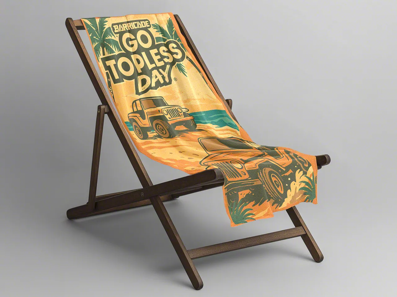 The Look. This Go Topless Day Beach Towel features a graphic design of two Jeeps driving across a beach with "BARRICADE GO TOPLESS DAY" written across the top.