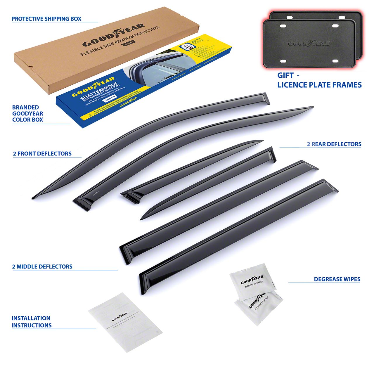 Get a perfect gift right now - 2 Goodyear License Plate Frames are included in the set. No tools needed simply peal and stick these window vent visors rain guards. We include degreasing wipes to make the job quick. This vent shade is a great birthday gift or holiday present for anyone who likes to drive with the window down. Side window deflectors come in a Goodyear color box protected by a brown shipping box.