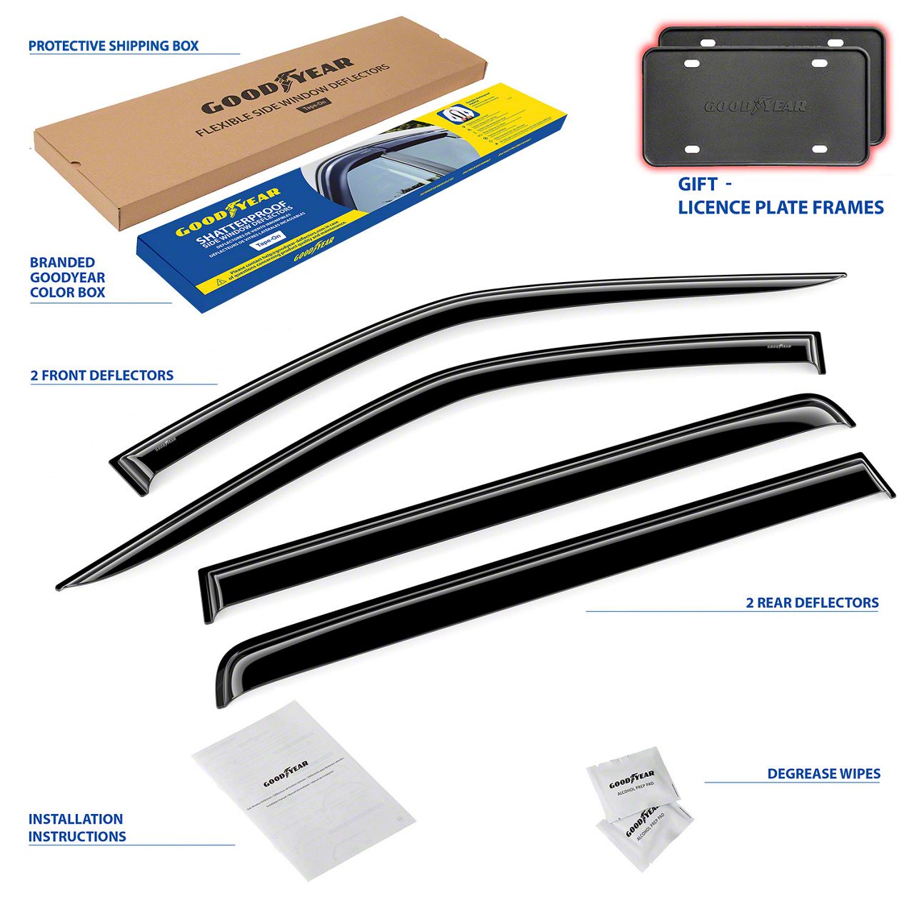 Installation. Putting this Goodyear Car Accessories Shatterproof Tape-On Window Deflectors on your ride is easy and requires no drilling.