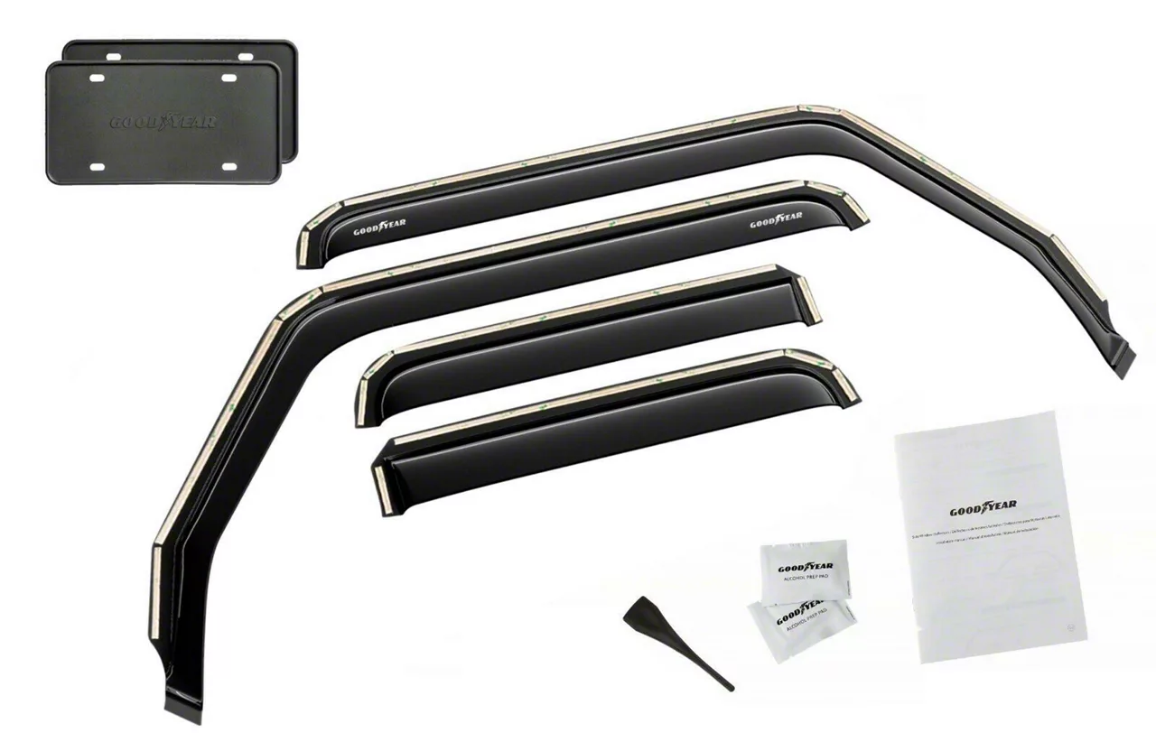 Description. GOODYEAR SIDE WINDOW DEFLECTORS the famous high quality in-channel rain guards that let you drive with your window down in rain, snow, ice and other inclement conditions. PRODUCT FEATURES: Made from durable, shatterproof polycarbonate; Allows fresh air circulation; Protects from rain and snow; Great for hot days and smokers; Backed by Limited Lifetime Warranty; Windows close tightly; Fits on top mirror mounts, no need to remove; Gives your vehicle a cool upgraded look; Car wash friendly. PROVIDES A CUSTOM FIT: - for Jeep Wrangler JL 2018-2023; - for Jeep Gladiator 2020-2023. PACKAGE INCLUDES: 2 Front deflectors; 2 Rear deflectors; Plastic blade; Degrease wipes. Installation instructions. Branded Goodyear color box. Protective shipping box. 100% MONEY BACK GUARANTEE ensures this will be your best bet for a pleasing no-risk purchase. Many customers love these Goodyear Window Guards so much they return to buy more. This makes a much appreciated gift for friends, family, and co-workers.