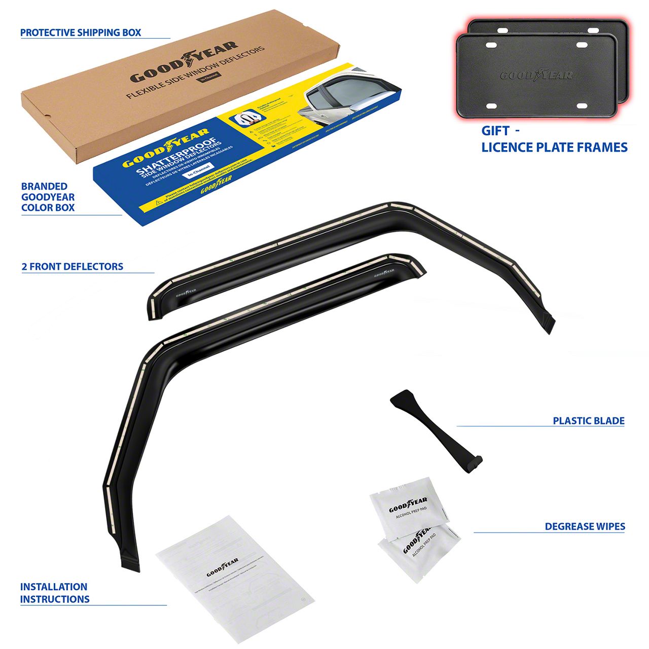 Thick ABS Mold. The Goodyear Car Accessories Shatterproof in-Channel Window Deflectors feature heavy-duty ABS plastic materials to ensure crackproof durability, withstanding heavy-duty protection against debris and consistent exposure to heat, providing you with proficient protection from the elements.